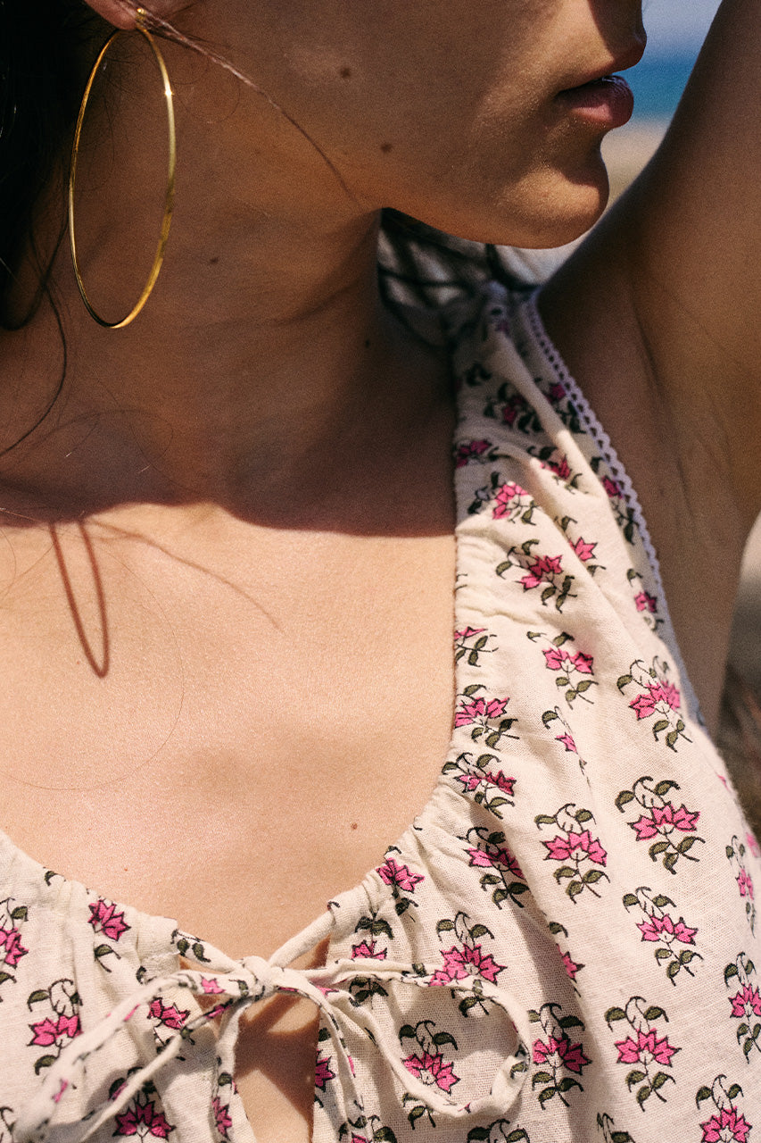 The Sundress Mini features a sleeveless silhouette with an adjustable tie gathering at the neckline and convenient pockets. Perfect for warm summer days or layered during the cooler months. Now available in one of our most popular prints, Peony.